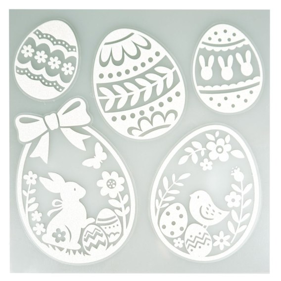 Duże naklejki dekoracyjne z motywami wielkanocnymi. Ażurowe naklejki w kolorze białym pokryte połyskującymi drobinami brokatu. Wzory umieszczone na przezroczystej folii po naklejeniu sprawiają efekt ażurowego wykończenia. Mix wzorów na blistrze o wymiarze 24 x 18,4 cm.