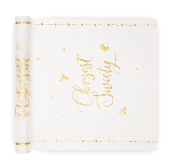 Wykonany z delikatnej przejrzystej organzy, bieżnik został ozdobiony złotymi motywami graficznymi i finezyjnym napisem Chrzest Święty. To ciekawy element dekoracji stołu, podkreślający uroczysty charakter spotkania.
