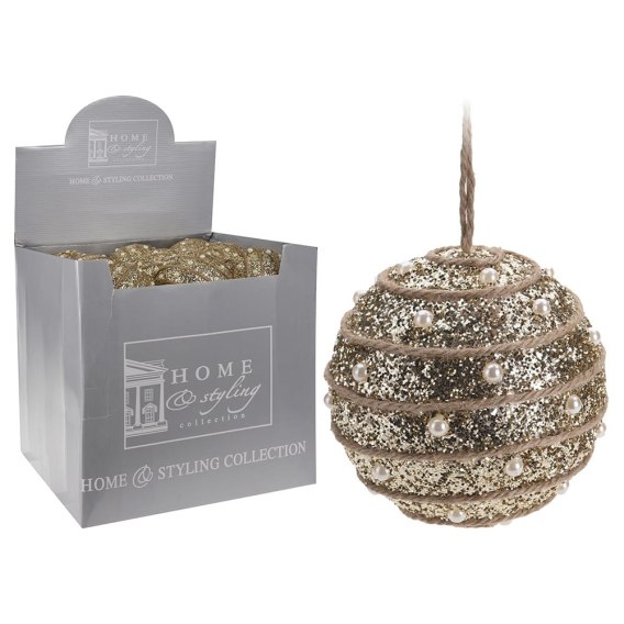 Bombka została wykonana z tworzywa sztucznego, jest zdobiona złotym brokatem i perełkami. Posiada sznurek do zawieszenia na choince bądź służyć jako ozdoba wnętrza w czasie świąt.