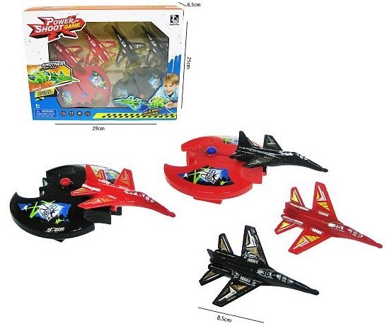 Zestaw zawiera dwa urządzenia do wystrzeliwania 11x8cm oraz cztery samoloty 8,5cm .
