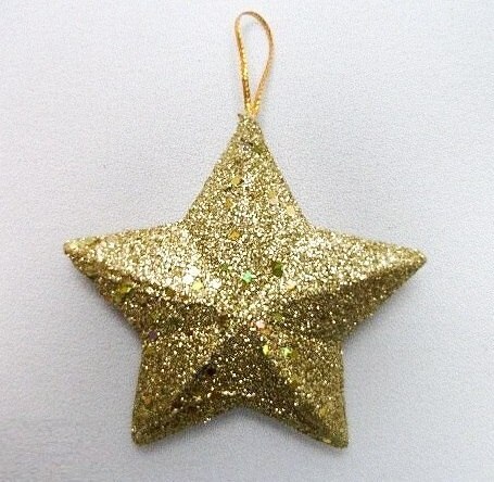 Zawieszki w kształcie gwiazdki wykończone mieniącym się, złotym brokatem, z sznureczkiem do zawieszenia. Gwiazdkami można przyozdobić zarówno choinkę, stroik czy inną dekorację świąteczną. Cena za opakowanie 12 szt.