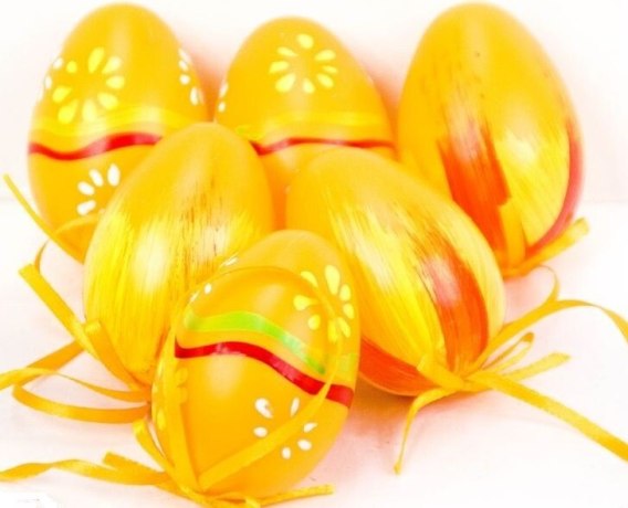 Zawieszane na sznureczku żółte pisanki (6 cm) z wstążką. Świetnie nadają się do dekoracji domu na Wielkanoc. Piękne, wiosenne kolory ożywią każde wnętrze nadając mu świątecznego klimatu.