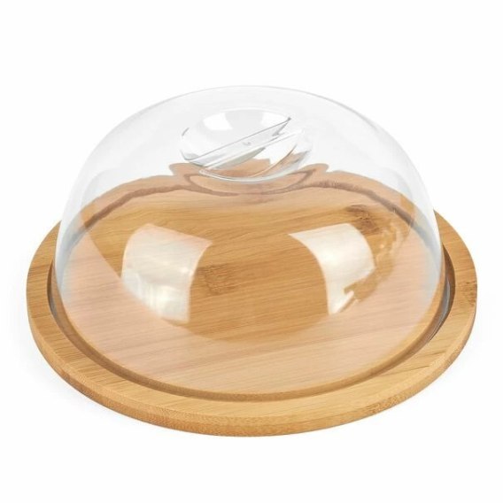 Deska bambusowa Tadar ma okrągły kształt o średnicy 18,8 cm. W komplecie znajduje się także transparentny klosz (kopuła) z praktycznym uchwytem o średnicy 16,7 cm. Wchodzi on w rowek wyżłobiony w desce tworząc szczelne zamknięcie. Dzięki niemu zachowasz na dłużej świeżość produktów.