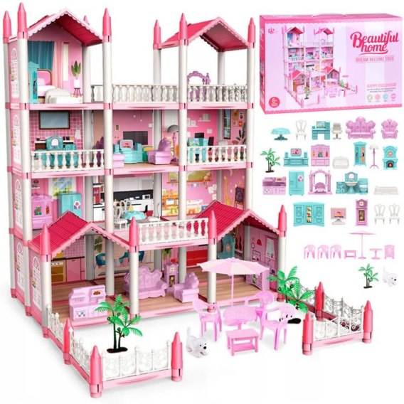 Piękny różowy domek willa z mebelkami - wieloelementowy zestaw zapewni mnóstwo kreatywnej zabawy każdej dziewczynce. Z pewnością nie zabraknie pomysłów na zabawę.