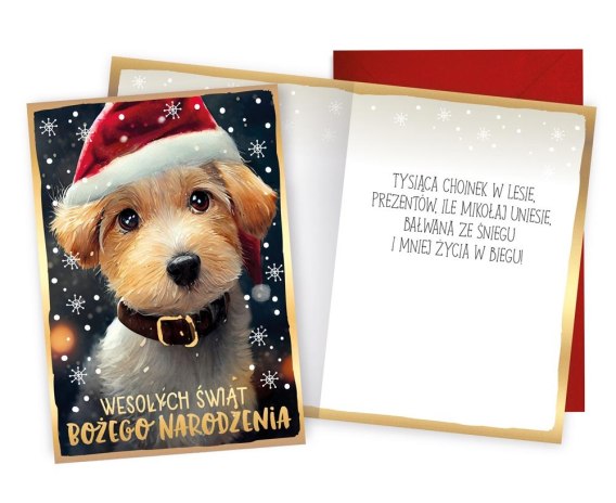 Kartka wielkości B6, zdobiona w zależności od wzoru metaliczną folią lub brokatem. Każda kartka posiada kolorowe życzenia w środku i dopasowaną kopertę w komplecie.