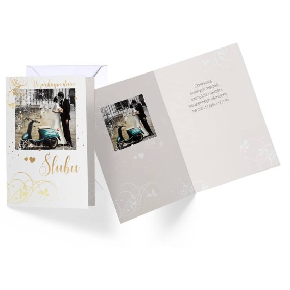 Kartka okolicznościowa z okazji Ślubu to doskonały dodatek do prezentu. Niesamowity karnet okolicznościowy jest pamiątką, którą można zachować na całe życie. Do karnetu okolicznościowego dołączona jest koperta, w której możesz umieścić nie tylko kartkę, ale również pieniądze lub papierowy voucher.