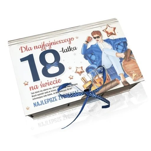 Pudełko z sześcioma przegródkami na gadżety dla chłopaka z okazji 18 urodzin. Kolorowy nadruk z motywem eleganckiego pełnoletniego chłopaka. Pudełko w przegródkach wypełnione wełną drzewną i żetonami na różne okazje. Pakowane w folię.