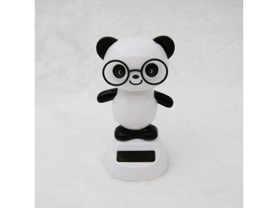 Solarna figurka w motywie pandy w okularach, która porusza głową i rękoma, gdy panel słoneczny wystawiony jest na słońce.