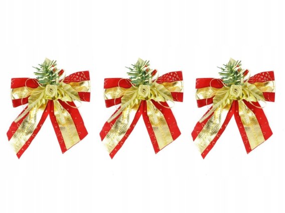 Czerwono-złote kokardki dekoracyjne zdobione kawałkiem gałązki choinkowej. Wykonane z błyszczącego materiału. idealna ozdoba choinki, girlandy, stroika lub prezentu.