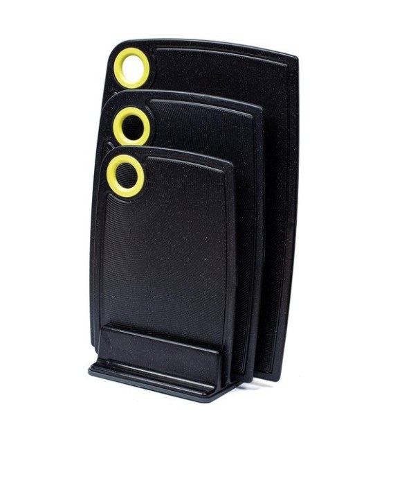 Zestaw desek do krojenia na stojaku ułatwi codzienne przygotowanie posiłków. Plastikowe deski w trzech rozmiarach zabezpieczą twój blat podczas pracy. Komplet desek kuchennych wyposażonych w antypoślizgowe gumki utrzymują określoną pozycję w czasie ich użytkowania. Komplet desek kuchennych z dodatkowym stojakiem wprowadzi ład i porządek w twojej kuchni.