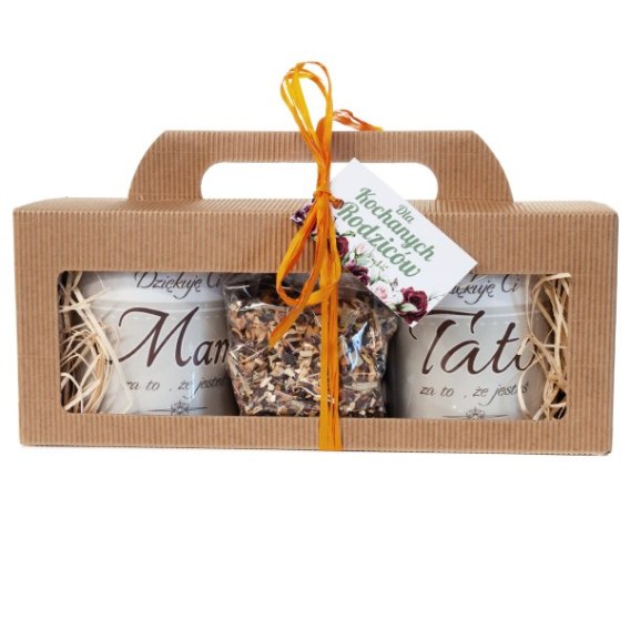 Komplet dwóch kubków Dla Kochanych Rodziców w odobnym opakowaniu kubek "Dziękuję Ci Mamo i Dziękuję Ci Tato + herbatka DIL-P-2KU