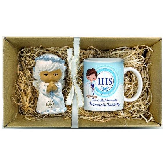 • Komplet w pudełku kubek 330ml + aniołek 12cm NIEBIESKI KOMUNIA ŚW