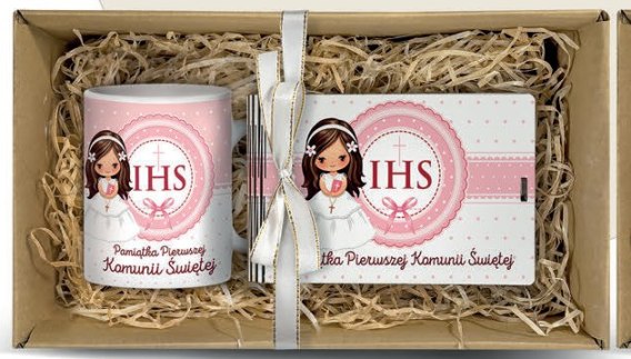 Komplet w pudełku kubek 330ml + banknotówka 10 x 15,5cm RÓŻOWY KOMUNIA ŚW