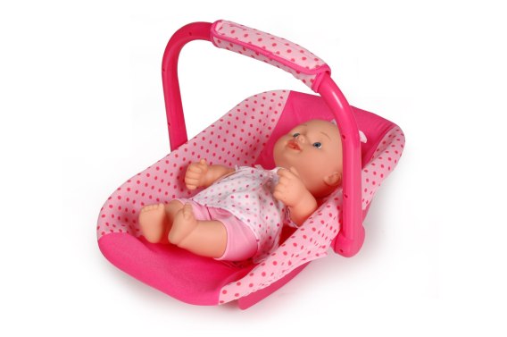 Ma śliczne ubranko i można ją zabrać ze sobą do samochodu lub na spacerek w specjalnym nosidełku.