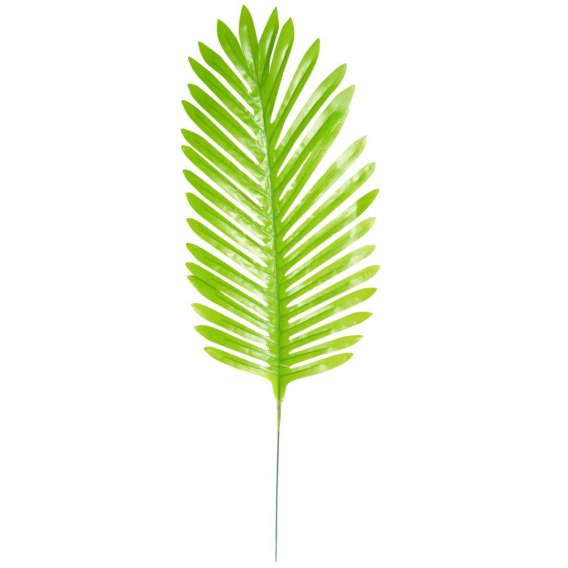 Sztuczny duży liść palmy w kolorze zielonym. Dekoracyjny liść do stroików i kompozycji z kwiatów sztucznych, dekoracji przyjęć w stylu tropikalnym, dekoracji wiosennych. Liść zamocowany na druciku poddającym się kształtowaniu. Długość całkowita ozdoby - 51 cm.