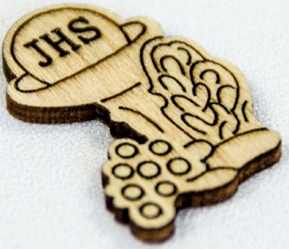 Drewniana, mała 3,5 cm monstrancja, doskonały dodatek do dekoracji komunijnych, ciast i tortów. Może również służyć jako element dekoracji ręczenie robionych zaproszeń czy podziękowań komunijnych. Pakowana jest po 12 szt.