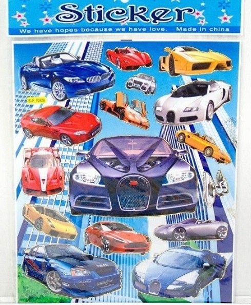 Blister z kolorowymi naklejkami samochodów w różnych wielkościach. Nadają się wyśmienicie do dekoracji dziecięcego pokoju.