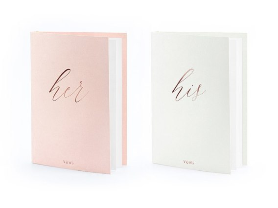 Okładki na przysięgi ślubne, zestaw zawiera: okładkę różową z napisem ''Her'' w kolorze różowego złota i szarą okładkę z napisem ''His'' w kolorze różowego złota. Rozmiar ok. 15 x 11 cm.