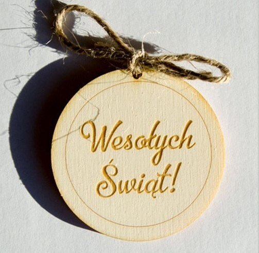 Zawieszana na jutowym sznureczku drewniana etykieta z tekstem "Wesołych Świąt". Idealnie nadaje się jako dodatek do prezentów, alkoholu czy jako element kompozycji dekoracyjnych na święta Bożego Narodzenia. Cena podana za opakowanie 10 szt. tych samych zawieszek.