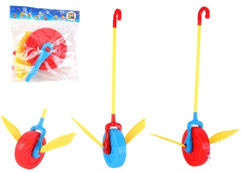 - Prosty w obsłudze: Wystarczy pchać zabawkę, aby koło z kolorowymi skrzydełkami się kręciło.