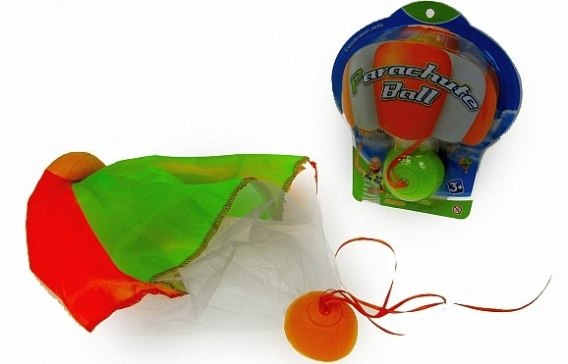 Piłeczka gumowa z dwóch części o średnicy 6cm , należy umieścić spadochron w piłeczce , zamknąć ją przy użyciu tasiemek i dynamicznym ruchem podrzucić do góry . Wówczas rozłoży sie czasza spadochornu i będzie spadał .