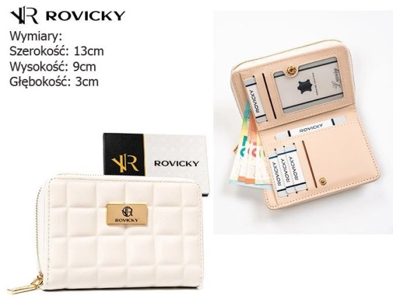 - Mały, pikowany portfel damski wykonany ze skóry ekologicznej. Model z zewnętrzną kieszenią na bilon zamykaną suwakiem oraz klasyczną sekcją na karty. Mieści dowód rejestracyjny. Zapakowany w pudełko producenta.