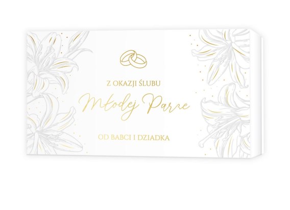 Pudełko z okazji Ślubu idealnie sprawdzi się do wręczenia małego upominku lub banknotów. Wykonane z grubej tektury i foliowanego papieru, tak by zachować trwałość. Ozdobione złoceniem i tłoczeniem, przy użyciu eleganckiego wzornictwa. W środku zawiera kartkę z życzeniami i miejscem na wpis.