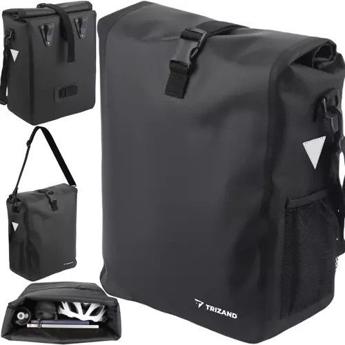 • WODOODPORNOŚĆ + BEZPIECZEŃSTWO - torba została wykonana została z wodoodpornego i bardzo mocnego materiału poliester + PVC więc doskonale zabezpieczać będzie nawet ciężkie przedmioty także w trakcie niekorzystnych warunków atmosferycznych. Po bokach sakwy znajdują się dodatkowe odblaski zwiększające widoczność użytkownika po zmroku.