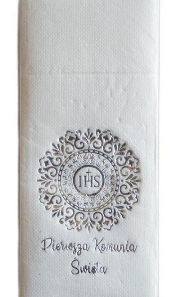 Serwetki 32x38 cm, starannie złożone w formie eleganckich kieszonek na sztućce, z srebrnym, błyszczącym nadrukiem Hostii i napisem "Pierwsza Komunia Święta" są doskonałym uzupełnieniem każdej komunijnej uroczystości. Wykonane są one z grubej i chłonnej bibuły (100 % celuloza)