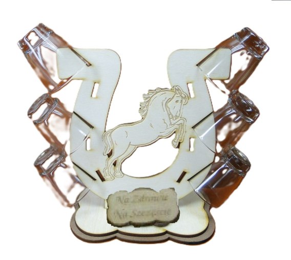 Stojak Podkowa koń jasna + 6 kieliszków, wykonany z drewna.