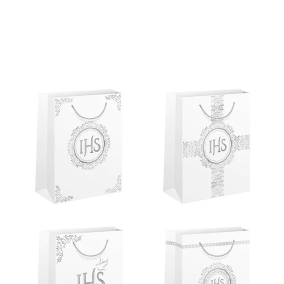 • Torebki na prezenty 15x20cm komunijne IHS biało-srebrne małe 12szt. mix 132067
