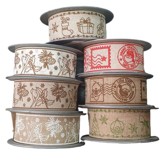 Wstążka lniana tkana motywem świątecznym 4cm x 10yd