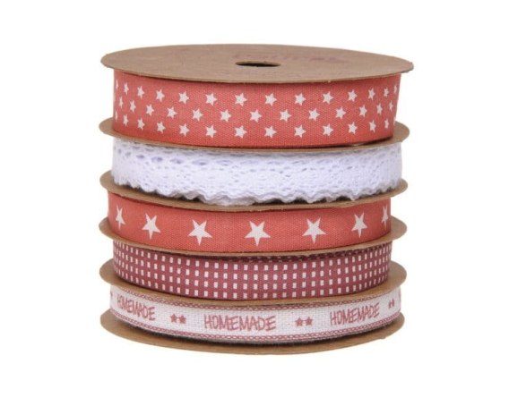 Dominującym kolorem szaty graficznej jest czerwony, który idealnie wpisuje się w klimat świąteczny. Zestaw tasiemek ozdobnych prezentuje motyw gwiazdki, świątecznej kraty oraz stylowej koronki.
