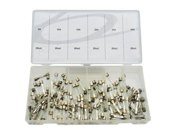 Zestaw 120 bezpieczników szklanych o 6 różnych natężeniach prądu od 5A do 30A.