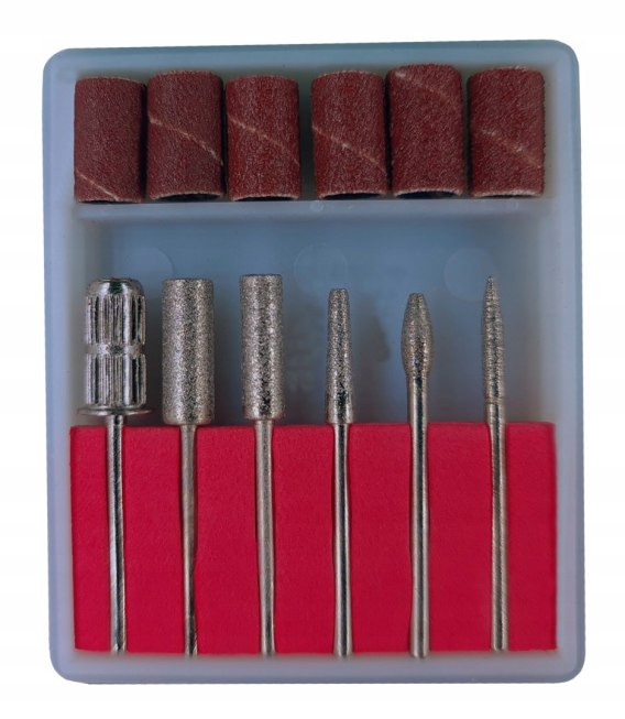 W zestawie znajduje się 5 frezów diamentowych, nośnik do nakładek ściernych oraz 6 nakładek ściernych.